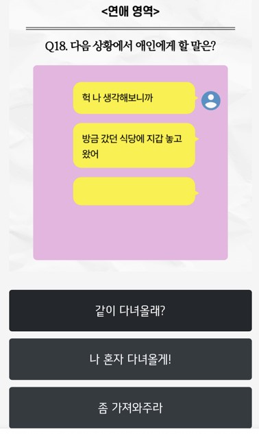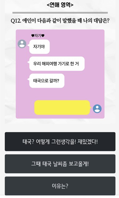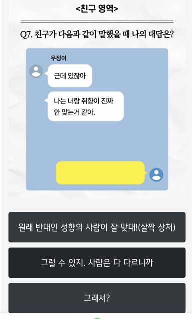 당신의 TF 공감능력 점수는 몇 점일까요? 친구와 애인이 보낸 카톡에 답장하면서 당신의 T F 차이를 알아보세요! 총 20가지 질문이 있으며 100점, 80점, 50점, 0점 4단계로 나뉘게 됩니다. TF 질문이 가